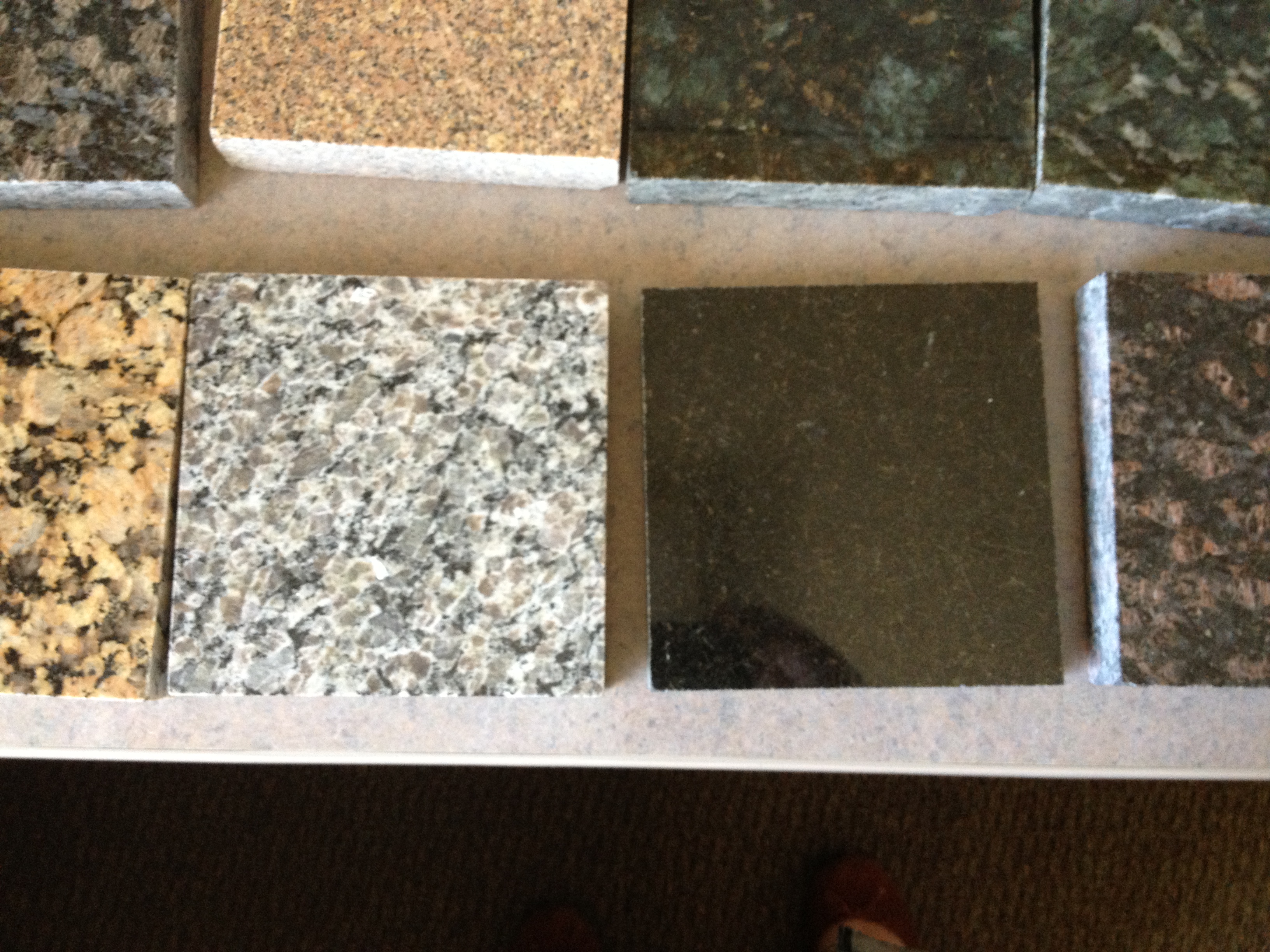 Countertops (kitchen & full baths)– granite comes standard (no upgrade charge) with our builder. We had a selection of eight granite options. I have to admit that granite would not have been my first choice of countertop material. I just don’t like how busy the patterns can get. If I were custom building a home, I would pick something more uniform like soapstone or quartz or even butcher block. But, I am thankful our builder uses granite and not laminate. Here were the options, I zoned in on the middle two in the bottom row pretty quickly, as you might be able to tell by the way this photo is centered. The stones are Nara Brown and Black Pearl. Can you guess which one we went with?